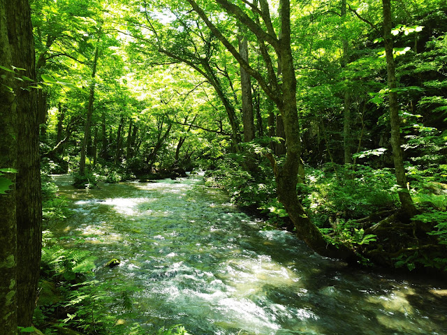 和Naoko桑打過招呼之後就去走路了!沿著蔦川走,走了一段路後不知為何又繞回了奧入瀨溪流館附近,路上全是看起來秋天會很厲害的楓樹。星野集團的飯店也在附近,門面光鮮,但價格高不可攀XD尤其對單獨旅行的人而言。在土特產店裡買了個銅鑼燒冰淇淋,草莓味,一路走回民宿再出發去附近的溫泉浴室洗澡。